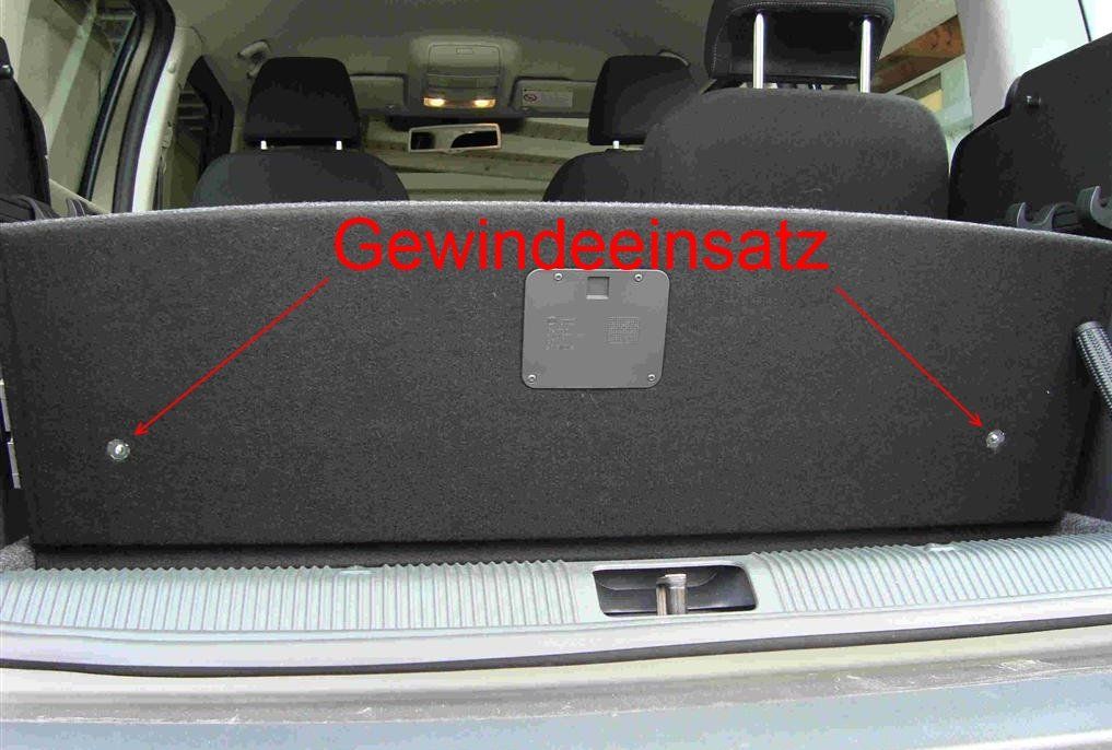 Bei PKWs mit doppeltem Boden können Einziehgewinde montiert werden. Hierzu müssen im Boden zwei 8 mm starke Bohrungen eingebracht werden, durch die dann von unten das Einziehgewinde eingelegt wird.