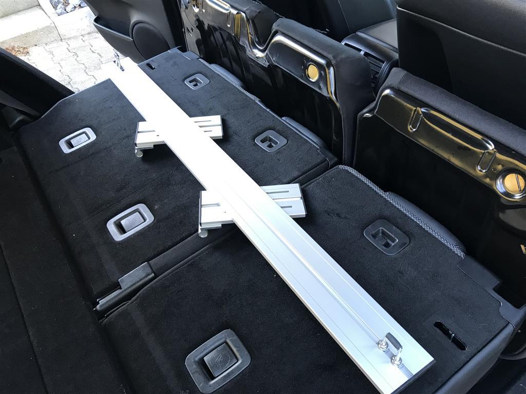 Sind keinerlei Befestigungspunkte im Fahrzeug auffindbar, an denen der Träger befestigt werden könnte, so gibt es oft die Möglichkeit, Adapterstücke in die Sitzlehnenrückenseiten zu verschrauben. Hierzu müssten 2 Adapterstücke verschraubt werden. Vier zu bohrende 3 mm Löcher sind kaum sichtbar. Die Adapterstücke und Schrauben sind aus Edelstahl und können im Fahrzeug eingebaut bleiben, so dass der Träger bei Bedarf schnell mit 2 Sterngriffschrauben montiert werden kann. Im eingebauten Zustand liegt der Adapter genau in der Nut des Trägers und verbessert somit die Stabilität.